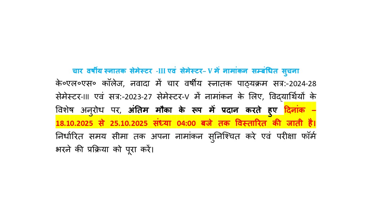 K.L.S. College, Nawada, is the oldest and premier co-ed institution in Nawada district. The College started its journey in 1957 and runs under the sweet shadow of the Magadh University, Bodh-Gaya. Since then this college has been developed as an icon of the teaching and learning process, infrastructural advancement, student progression, and overall development of a young generation of the state, particularly the Nawada and Nalanda districts of Bihar state. The vision and mission of our College are to nurture and develop the underprivileged, rural, and talented young generation into responsible, independent, and resourceful people for the nation by providing quality and practical-based education, guidance, and helping them to find the new heights in their lives. We aim at enlightening and empowering the youth to become socially responsible citizens and to equip them to compete in a multicultural environment.